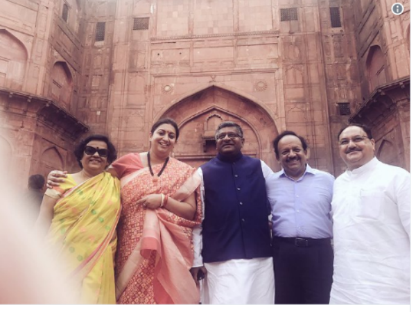 जो कि लाल किले के ठीक पीछे की है और जिसमें उनके साथ केंद्रीय कानून मंत्री रविशंकर प्रसाद, भाजपा के दिग्गज नेता हर्षवर्धन दिख रहे हैं। स्मृति ने ट्विट में लिखा है कि Behind the scenes with seniors @JPNadda ji @rsprasad ji@drharshvardhan ji#IndependenceDay.