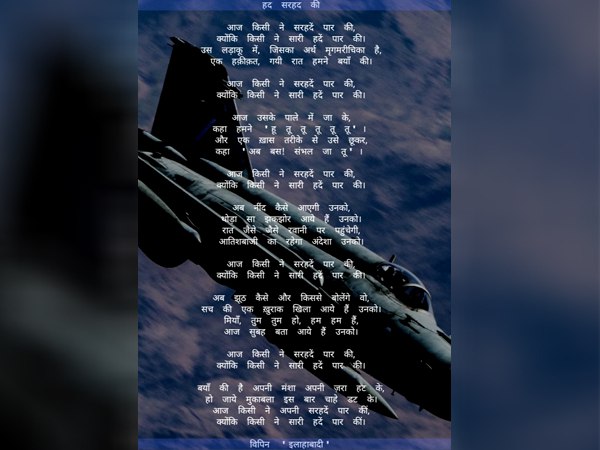 कविता के मुताबिक इस योद्ध को उस समय सीमा पार करनी पड़ी जब किसी ने अपनी सारी हदों को तोड़ दिया था। कविता को लिखने वाले बिपिन इलाहाबादी ने अपनी लाइनों के साथ ही इशारा कर दिया है कि आईएएफ ने 26 फरवरी को एलओसी पार की। इसके साथ ही आईएएफ ने बालाकोट में जैश-ए-मोहम्मद के अड्डे पर हमला किया जो कि पाक के खैबर पख्तूनख्वा में स्थित है।