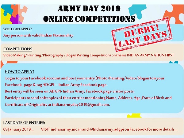 इस प्रतियोगिता में भाग लेने की अंतिम तिथि 9 जनवरी, 2019 है। https://indianarmy.nic.in/index.aspx के जरिए आप अधिक जानकारी हासिल कर सकते हैं। या फिर सेना के फेसबुक पेज @indianarmy.adgpi पर जाकर अधिक जानकारी हासिल कर सकते हैं। इस प्रतियोगिता के दौरान उत्कृष्ट कला को आर्मी पेज पर देखा जा सकेगा। इसके लिए आवेदकों को अपना नाम, पता, उम्र, जन्मतिथि और एक पहचान पत्र [email protected] पर भेजना होगा।