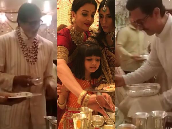 अमिताभ बच्चन ने ईशा की शादी में फेरों की रस्में भी पढ़ी थीं। महानायक के अलावा बॉलीवुड के और सितारे भी खाना खिलाते नजर आए। आमिर खान का भी मेहमानों को खाना परोसते वीडियो काफी वायरल हो रहा है। वो अपने हाथों से कोई डिश मेहमानों की थाली में रख रहे हैं। आमिर के अलावा ऐश्वर्या और शाहरुख ने भी मेहमाननवाजी में अंबानी परिवार का हाथ बंटाया। ऐश्वर्या अंबानी परिवार की होने वाली बड़ी बहू श्लोका मेहता के साथ मेहमानों को खाना खिलाती दिखीं।