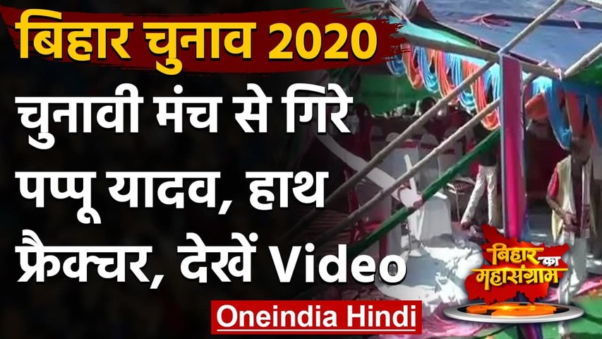 नई दिल्ली: बिहार विधानसभा चुनाव के पहले चरण का मतदान संपन्न हो चुका है। ऐसे में अब सभी पार्टियां दूसरे और तीसरे चरण की तैयारियों में लगी हैं। इस बीच शनिवार को जन अधिकार पार्टी के नेता पप्पू यादव मुजफ्फरपुर के मीनापुर विधानसभा में अपने पार्टी के प्रत्याशी के लिए वोट मांगने पहुंचे। इस दौरान वहां पर एक सभा भी आयोजित की गई। जैसे ही मंच पर पप्पू यादव ने भाषण देना शुरू किया, वैसे ही मंच टूटकर गिर गया। जिससे उनके हाथ में फैक्चर हुआ है।