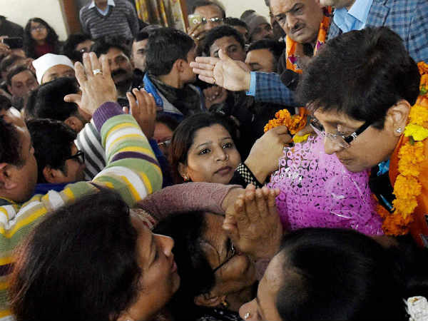 भाजपा की सीएम उम्मीदवार किरण बेदी रैली के दौरान लोगों से मिलती हुंई।