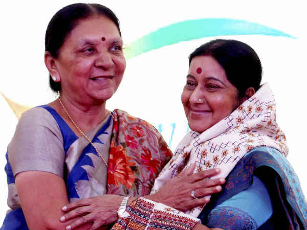 विदेश मंत्री सुषमा स्वराज से गले मिलते हुई गुजरात की सीएम आनंदीबेन पटेल।
