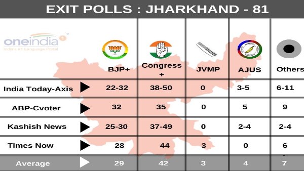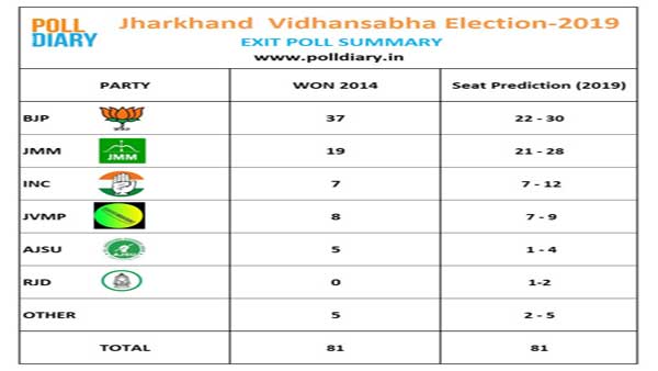 नई दिल्ली। झारखंड विधानसभा चुनाव को लेकर पांचवें और आखिरी दौर की वोटिंग संपन्न होने के साथ ही अब सभी को इंतजार चुनाव नतीजों का है। आखिरी फेज में मतदाताओं ने जमकर अपने मताधिकार का इस्तेमाल किया। इस बार 68.99 फीसदी वोटिंग हुई है। शुक्रवार को शाम में आखिरी फेज की वोटिंग संपन्न होने के साथ ही प्रदेश की सभी 81 विधानसभा सीटों पर चुनावी प्रक्रिया पूरी हो गई। इस बार झारखंड में किसकी सरकार बनेगी, फिलहाल इसका पता 23 दिसंबर को चलेगा जब वोटों की गिनती होगी। हालांकि, नतीजों से पहले शुक्रवार को मतदान संपन्न होने के बाद एक-एक कर तमाम एजेंसियों के एग्जिट पोल सामने आए। इनमें ज्यादातर एग्जिट पोल में प्रदेश की सत्ताधारी बीजेपी को करारी शिकस्त का अनुमान जताया गया है। जानिए अलग-अलग एजेंसियों के एग्जिट पोल में क्या हैं नतीजें...