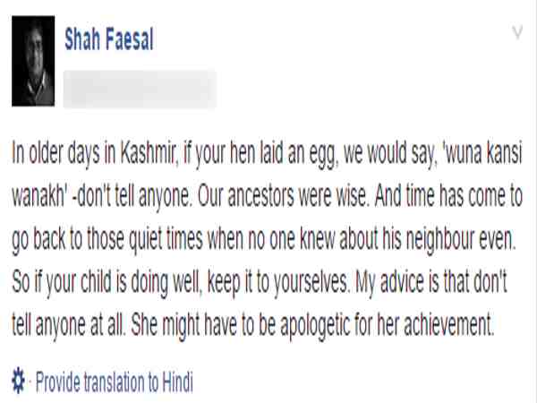 शाह फैसल ने लिखा है कि कश्मीर के पुराने दिनों में जब आपकी मुर्गी कोई अंडा देती थी, तो हम करते कि किसी को नहीं बताना। हमारे पूर्वज होशियार थे। अब फिर वही समय आ गया है कि हमें बीते समय में जाना चाहिए। इसलिए अगर आपका बच्चा कुछ अच्छा कर रहा है, तो इसे खुद तक सीमित रखिए। मेरी सलाह है कि इसे किसी को ना बताइए। उसे अपनी सफलता के लिए माफ मांगी पड़ सकती है।