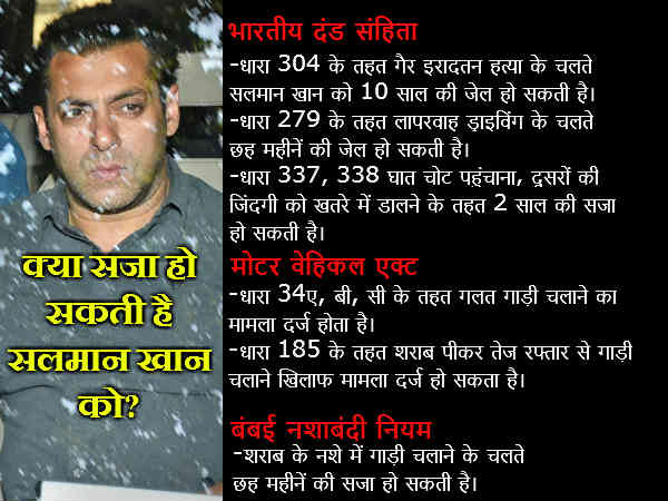 2002 में मुंबई में सलमान खान की कार से हुए रोड एक्सिडेंट के मामले में आज 13 साल बाद फैसला आ रहा है। वहीं इस मामले में सलमान खान को 10 साल की सजा हो सकती है। लेकिन कोर्ट ने जिस तरह से सलमान खान से कहा कि आप कार चला रहे थे और आप उस वक्त शराब के नशे में थे जिसके बाद सलमान खान का जेल जाना लगभग तय माना जा रहा है। ऐसे में जानिये कानून क्या कहता है और ऐसे में सलमान को किन-किन धाराओं में क्या सजा हो सकती है।