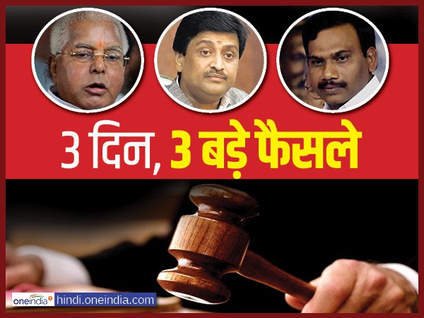 नई दिल्ली। पिछले तीन दिनों में कोर्ट ने लगातार तीन बड़े मामलों में अहम फैसला सुनाया है, इन तीनों ही फैसलों का सियासी हलकों में खासा असर देखने को मिला है। पहले 2जी स्पेक्ट्रम घोटाला, फिर आदर्श घोटाला और अब चारा घोटाले में कोर्ट ने बड़ा फैसला सुनाया है। जिन तीन मामलों में फैसले सुनाए गए उनमें पहले दो मामलों में आरोपियों को जहां बड़ी राहत मिली है, वहीं तीसरे मामले यानी बहुचर्चित चारा घोटाले से जुड़े एक मामले में आरजेडी सुप्रीमो लालू प्रसाद यादव को राहत नहीं मिल सकी है। उन्हें चारा घोटाले से जुड़े मामले में दोषी करार दिया गया है, उनकी सजा का ऐलान 3 जनवरी को होगा। एक नजर तीन दिन में सुनाए गए तीन बड़े फैसलों पर...
