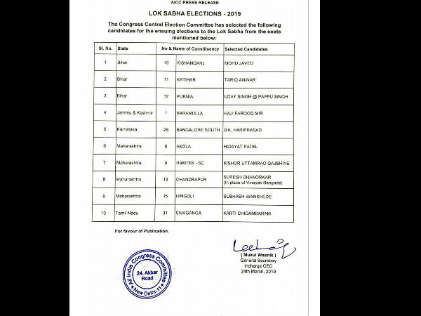 कांग्रेस उम्मीदवारों की इस लिस्ट में सबसे चौंकाने वाला नाम कर्ति चिंदबरम का है। ऐसा इसलिए क्योंकि कार्ति चिदंबरम पर भ्रष्टाचार के गंभीर आरोप हैं। वो एयरसेल-मैक्सिस केस में भी आरोपी हैं। आईएनएक्स (INX)मीडिया मामले में भी उनपर केस चल रहा है। पिछले साल ईडी ने इस केस में कार्ति को गिरफ्तार भी किया था, लेकिन बाद में उन्होंने बेल ले ली थी। इन आरोपों के बावजूद कांग्रेस ने कर्ति चिंदबरम को टिकट देकर सबको चौंका दिया है।