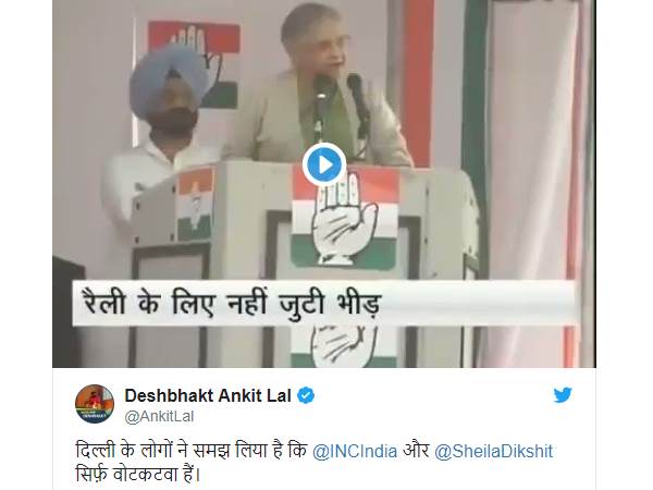 नई दिल्ली। आम आदमी पार्टी के सोशल मीडिया हेड अंकित लाल ने सोशल मीडिया पर एक पुराना वीडियो शेयर कर कांग्रेस को वोटकटुवा पार्टी बता दिया। अंकित लाल ने दिल्ली की पूर्व मुख्यमंत्री और दिल्ली कांग्रेस की प्रदेश अध्यक्ष शीला दीक्षित का एक ट्विटर वीडियो पर शेयर किया है, जिसमें उनकी रैली में भीड़ ना आने की बात कही जा रही है।
