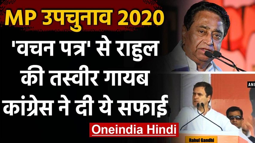 नई दिल्ली। मध्य प्रदेश की 28 विधानसभा सीट पर उपचुनाव हो रहा है। उपचुनाव के लिए बुधवार को कांग्रेस ने अपना वचन पत्र जारी किया है। वचन पत्र पर कमलनाथ की बड़ी फोटो है। उनके अलावा वचन पत्र पर पूर्व पीएम इंदिरा गांधी और कांग्रेस अध्यक्ष सोनिया गांधी की तस्वीरें हैं लेकिन कांग्रेस के पूर्व अध्यक्ष राहुल गांधी और पूर्व मुख्यमंत्री दिग्विजय सिंह की फोटो नहीं हैं।
