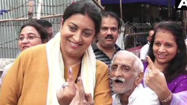 पोलिंग बूथ पर 93 साल रिटायर्ड सैनिक से मिलीं स्मृति ईरानी