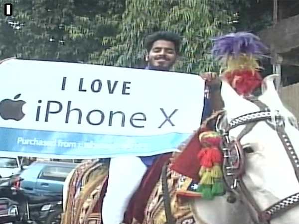 महाराष्ट्र के थाणे में एक शख्स की आईफोन-एक्स के लिए दीवानगी इतनी बढ़ गई कि वह इसे खरीदने के लिए गाजे-बाजे के साथ जा पहुंचा। जिस तरह से यह शख्स आईफोन-एक्स खरीदने गया, वह मंजर किसी बारात से कम नहीं था। थाणे के नवपारा में रहने वाला यह शख्स घोड़े पर चढ़कर ढोल-नगाड़ों के साथ आईफोन एक्स खरीदने पहुंचा। जिसने भी इस शख्स को देखा वह हैरान रह गया।