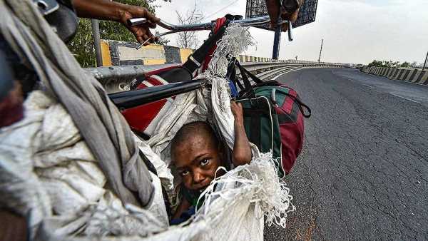 मजदूर ने साइकिल के आगे डंडे में एक प्लास्टिक का बोरा बांध रखा है और इस बोरो में उसने बच्ची को लिटाया हुआ है। दिल्ली से उत्तर प्रदेश के लिए परिवार की इस दिव्यांग बच्ची की तस्वीरें दिल तोड़ने वाली हैं। ये बच्ची ऐसे देख रही है मानों कोई इनकी मदद करेगा और वो इस बोरे से निकल सकेगी। गर्मी में ये बच्ची के लिए बहुत मुश्किल है लेकिन परिवार के पास और कोई चारा भी नहीं है।