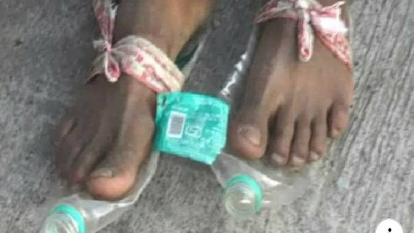नई दिल्ली: देश में मजदूर वर्ग की हालत पहले से ही खराब थी। दिन-रात मेहनत करने के बाद उन्हें दो वक्त की रोटी नसीब होती थी। कोरोना की वजह से चल रहे लॉकडाउन ने मजदूरों की कमर तोड़कर रख दी है। काम धंधा बंद होने से मजदूर अपने गांवों की ओर रुख करने लगे हैं। उन्हें उम्मीद है कि गांव में पहुंचने के बाद अपने लोग उनकी मदद करेंगे और उन्हें भूखा नहीं सोना पड़ेगा, लेकिन मजदूरों के घर का रास्ता इतना आसान नहीं है। एक तो गर्मी, ऊपर से पुलिस वालों की सख्ती मजदूरों के लिए मुसीबत बनती जा रही है। सोशल मीडिया पर मजदूरों के बुरे हालात को दिखाती एक फोटो वायरल हो रही है, जिसमें लोग प्लास्टिक की बोतल से बनी चप्पल पहने नजर आ रहे हैं।