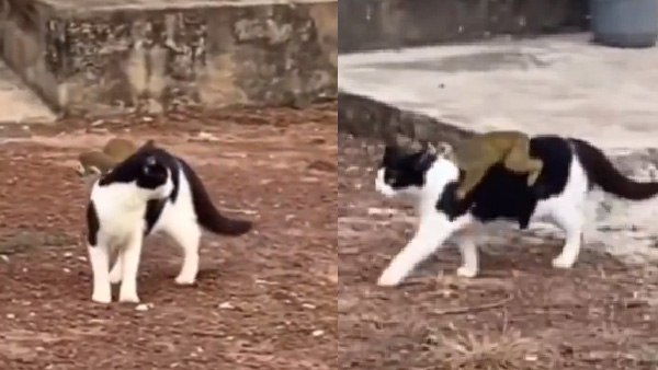 बिल्ली की पीठ पर बैठकर बंदर सवारी कर रहा है। वीडियो में दोनों को सड़क पर घूमते हुए दिखाया गया है। जिसमें बंदर ने बिल्ली की पीठ को कसकर पकड़ रखा है। इस वीडियो को ट्विटर यूजर बुइटेन्गेबिडेन ने शेयर किया है। जिसके कैप्शन में लिखा है "फ्री राइड लेना।"
