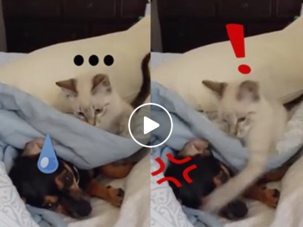 इस वीडियो में आप देख सकते हैं कि कैसे एक ही बिस्तर पर एक बिल्ली और कुत्ता साथ लेटे हुए हैं। वीडियो में साफ दिख रहा है कि कुत्ता सोने क कोशिश कर रहा है। पर बिल्ली उसे सोने नहीं दे रही है।