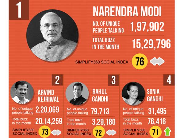 नरेंद्र मोदी ने 76 एसएसआई का आंकडा छुआ है। लगभग 1,97,902 लोगों ने मार्च 2014 में मोदी के बारे में चर्चा की। मार्च में अकेले मोदी ने 15,29,796 का बज़ किएट किया। इसी जंग में 'आम आदमी' अरविन्द केजरीवाल यूनिक टॉक में मोदी से आगे व एसएसआई में दूसरे नंबर पर हैं। लगभग 2,20,069 लोगों के बीच केजरीवाल की चर्चा हुई व उन्होने 73 ऐसएसआई का आंकड़ा छू लिया है।