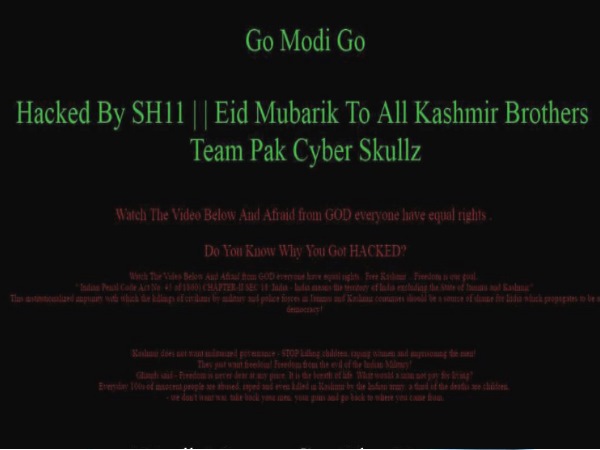 हैकर ने वेबसाइट पर मैसेज में मोदी वापस जाओ लिखा है। साथ ही सभी कश्मीर के लोगों को ईद की बधाई दी है। मैसेज की मानें तो यह हैकिंग पाकिस्तान की तरफ से की गई है। मैसेज में लिखा है टीम पाक साइबर स्कूल्ज। मैसेज में यह भी लिखा है कि नीचे दिया गया वीडियो देखो और भगवान से डरो, सभी के पास समान अधिकार हैं।