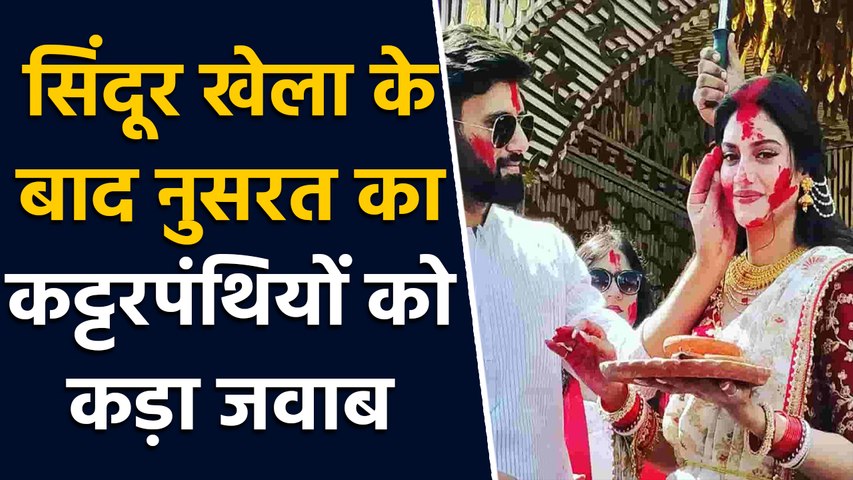 नवरात्र की महाअष्टमी के दिन टीएमसी सांसद नुसरत जहां अपने पति निखिल जैन के साथ दुर्गा पूजा समारोह में शामिल होने के लिए पहुंचीं थीं। इस दौरान नुसरत पारंपरिक भारतीय अंदाज में नजर आईं। उन्होंने लाल रंग की साड़ी पहन रखी थीं और मांग में सिंदूर भी लगाया हुआ था। यही नहीं पूजा कार्यक्रम के दौरान वो ढोल की थाप पर डांस करती हुई भी दिखाई दी थीं। उनके इस तरह से दुर्गा पूजा समारोह में शामिल होने को लेकर बाद में काफी विवाद हुआ और देवबंदी उलेमा ने उनके रवैये पर नाराजगी जताई थी। हालांकि, नुसरत ने उस समय साफ तौर से कुछ नहीं कहा, लेकिन अब उन्होंने अपने विरोधियों को खास अंदाज में जवाब दिया है।