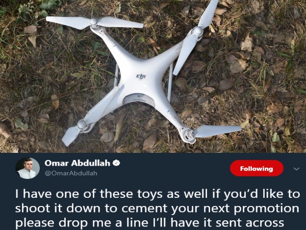 शुक्रवार शाम मेजर जनरल आसिफ गफूर ने ट्विटर पर पोस्ट किया कि एक भारतीय ड्रोन पाकिस्तान में जासूसी कर रहा था, जिसे मार गिरा दिया गया है। उन्होंने लिखा, 'रखचिकरी सेक्टर में जासूसी करते हुए एक भारतीय क्वैडकॉप्टर को पाक आर्मी ने मार गिराया। मलबा रख लिया गया है।' बस फिर क्या था, भारतीयों ने उनके दावे को झूठा बताने में जरा भी देर न लगाई। इसकी शुरुआत कांग्रेस नेता और जम्मू-कश्मीर के पूर्व मुख्यमंत्री उमर अब्दुल्ला ने की।