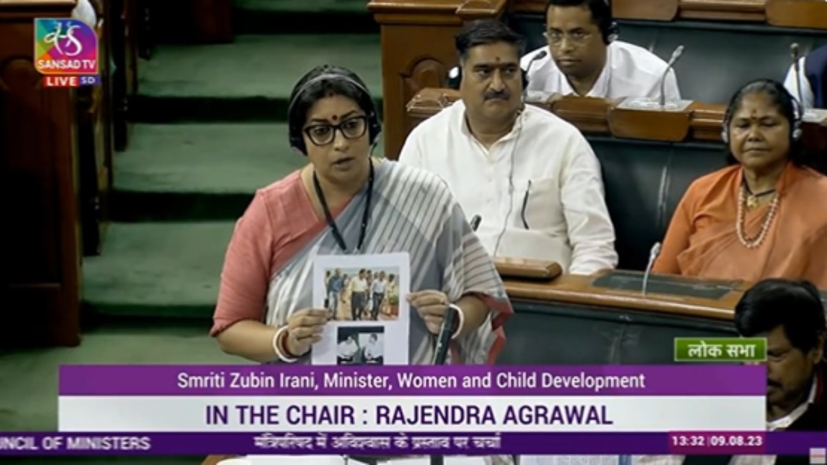 लोकसभा में बुधवार को राहुल गांधी के मणिपुर हिंसा पर दिए भाषण के बाद स्मृति ईरानी ने पलटवार करते हुए राजस्थान, कश्मीरी पंडित, असम और अडानी मुद्दे पर कांग्रेस को जमकर बरसीं।