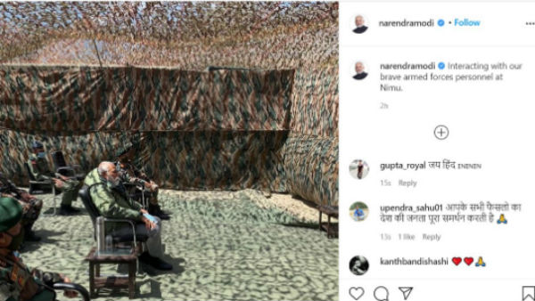 पीएम मोदी ने अपने दौरे की तस्वीर इंस्टाग्राम अकाउंट पर पोस्ट की है, आम तौर पर Twitter पर काफी एक्टिव रहने वाले प्रधानमंत्री ने इंस्ट्रागाम और फेसबुक पर अपनी लद्दाख यात्रा की तस्वीर पोस्ट की है, जो कि थोड़ी अचरज की बात है, अपनी फोटो को शेयर करते हुए पीएम मोदी ने लिखा है कि 'नीमू में हमारे बहादुर सशस्त्र बल के जवानों के साथ बातचीत की', पीएम मोदी की पोस्ट इस वक्त सोशल मीडिया पर काफी वायरल हो रही है और लोग आज पीएम मोदी के इस कदम की बहुत तारीफ कर रहे हैं।