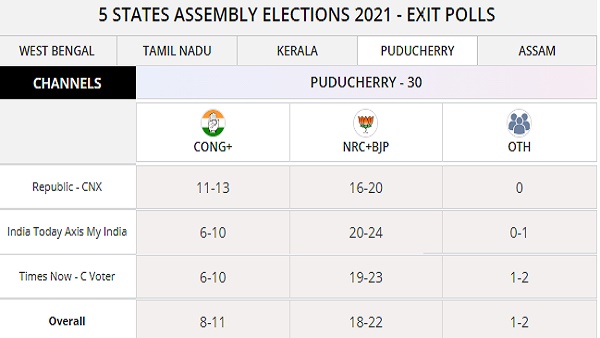 वन इंडिया के Polls of Polls में रिपब्लिक सीएनएक्स, इंडिया टुडे एक्सिस माई इंडिया और टाइम्स नाउ सी वोटर के सर्वे का औसत रिजल्ट निकाला है। उस हिसाब से पुडुचेरी की 30 विधानसभा सीटों में से बीजेपी गठबंधन को 18-22 सीटें मिलने का अनुमान है। वहीं कांग्रेस गठबंधन को 8-11 सीटें मिल सकती हैं।