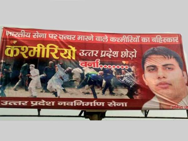 लखनऊ। कश्मीर में जारी हिंसा के बीच उत्तर प्रदेश में कश्मीरियों के खिलाफ एक विवादास्पद पोस्टर सामने आया है। पोस्टर में कश्मीरियों को उत्तर प्रदेश छोड़ने की चेतावनी दी गई है। यह विवादास्पद पोस्टर उत्तर प्रदेश नवनिर्माण सेना की ओर से लगाया गया है।