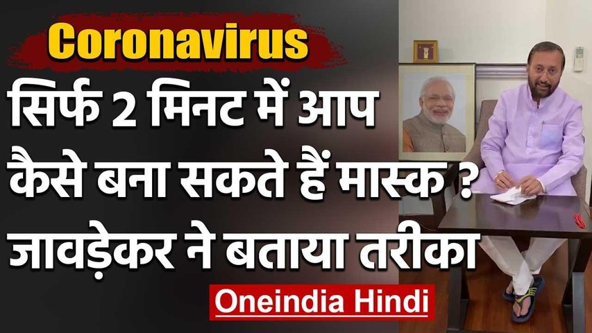 नई दिल्ली। देश में कोरोना वायरस से संक्रमित मरीजों की संख्या 9152 तक पहुंच गई है जबकि, इस वायरस के कारण 308 लोगों की मौत हो चुकी है। हालांकि, इस दौरान 857 मरीज ठीक हो चुके हैं। कोरोना वायरस से बचने के लिए लोगों को घरों में रहने की सलाह दी जा रही है और साथ ही अगर बाहर निकलना पड़े तो मास्क लगाने की सलाह दी जा रही है। ये मास्क आप घर बैठे-बैठे रुमाल से भी बना सकते हैं। केंद्रीय मंत्री प्रकाश जावड़ेकर ने एक वीडियो शेयर करते हुए बताया कि कैसे आप दो मिनट के अंदर मास्क बना सकते हैं।