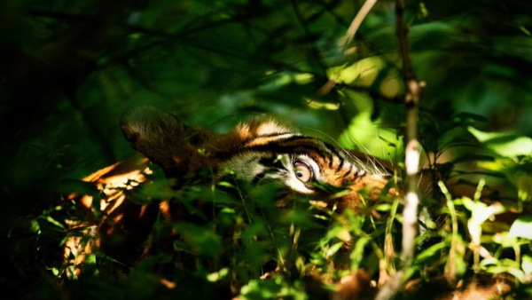 झाड़ियों में छिपकर एक आंख से जासूसी करता दिखा बाघ, प्रियंका गांधी के बेटे ने फोटो शेयर कर पूछा ये सवाल