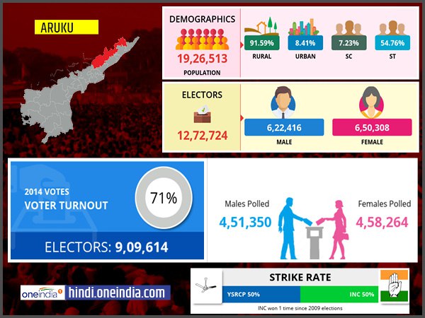 अराकू लोकसभा सीट के अंतर्गत सात विधानसभा सीट आती हैं। इनके नाम पालाकोंडा, कुरपम, पार्वथीपुरम, सैलूर, अरकू, रामपचवेंद्रम और पडेरू विधानसभा क्षेत्र आते हैं। ये सीट अनुसूचित जन जाति के लिए आरक्षित है। साल 2008 में ये लोकसभा सीट अस्तित्व में आई थी। इससे पहले 2009 के लोकसभा चुनाव में कांग्रेस के किशोर चंद्रदेव ने ये सीट जीती थी। 2009 के लोकसभा चुनाव में कांग्रेस के किशोर चंद्र देव को 360,458 वोट मिले, जबकि दूसरे पर सीपीआई एम और तीसरे नंबर पर पीआरपी रही। कांग्रेस के किशोर चंद्र देव ने ये सीट 192,444 वोटों से जीती। इस चुनाव में 67 प्रतिशत लोगों ने हिस्सा लिया।