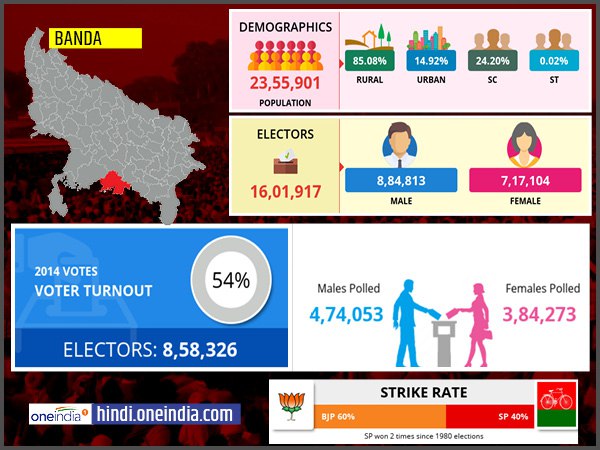 साल 2014 के चुनावों में इस सीट पर BSP दूसरे, सपा तीसरे और कांग्रेस चौथे नंबर पर रही थी। साल 2014 में यहां पर 1601855 मतदाताओं ने अपने मतों का इस्तेमाल किया था, जिसमें पुरुष मतदाताओं की संख्या 55 प्रतिशत और महिला मतदाताओं की संख्या 44 प्रतिशत थी। बांदा की 77 प्रतिशत आबादी हिंदू और 21 प्रतिशत जनसंख्या मुस्लिमों की है।