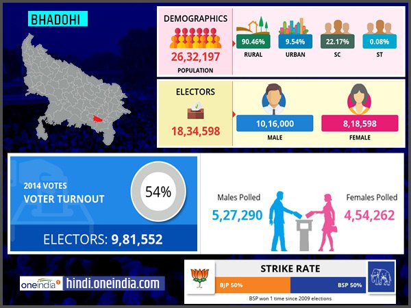 साल 2014 में यहां पर 1834598 मतदाताओं ने अपने मतों का इस्तेमाल किया था, जिसमें पुरुष मतदाताओं की संख्या 55 प्रतिशत और महिला मतदाताओं की संख्या 44 प्रतिशत थी। इस सीट पर नंबर 2 पर बसपा, नंबर 3 पर सपा और नंबर 4 पर JDU और 5 पर कांग्रेस थी। भदोही एक हिंदू बाहुल्य इलाका है, यहां की 86 प्रतिशत आबादी मुस्लिम और 12 प्रतिशत हिंदुओं की है। भाजपा और बसपा के बीच जीत का अंतर मात्र 16 प्रतिशत वोटों का था।