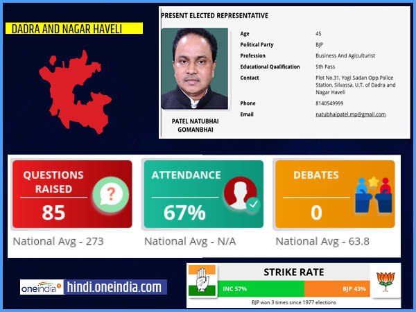नई दिल्ली: महाराष्ट्र और गुजरात के बीच स्थित दादर नागर एंड हवेली लोकसभा सीट से नाथू भाई गोमन भाई पटेल बीजेपी के सांसद हैं। वो 2009 में पहली बार वे सांसद चुने गये थे और 2014 में वे दूसरी बार चुनाव जीतकर संसद में पहुंचे। उन्होंने कांग्रेस के मोहन भाई सांझी भाई देलकर को हराया था। दादर नागर एंड हवेली लोकसभा सीट एसटी के लिए सुरक्षित है। यह पूरे केंद्र शासित प्रदेश में फैली हुई है। यहां 1779 तक मराठा शासकों ने राज किया और फिर 1954 तक पुर्तगाली साम्राज्य का यह हिस्सा रहा। 11 अगस्त 1961 को दादर नागर एंड हवेली भारत में शामिल किया गया। 62 प्रतिशत आबादी आदिवासियों की है। 40 प्रतिशत हिस्सा संरक्षित वन प्रदेश है। दमनगंगा यहां की प्रमुख नदी है जो अरब सागर में गिरती है।