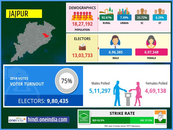 साल 2014 के लोकसभा चुनाव में जाजपुर में कुल 13 लाख 3 हज़ार 733 मतदाता थे। इनमें से 6 लाख 96 हज़ार 385 पुरुष मतदाता थे। विगत चुनाव में यहां 75 फीसदी मतदान हुआ था। यानी 9 लाख 80 हज़ार 435 मतदाताओं ने वोट डाले थे। 5 लाख 11 हज़ार से ज्यादा पुरुष मतदाताओँ ने वोट डाले थे, जबकि महिला मतदाताओं की संख्या 4 लाख 69 हज़ार 138 थी।