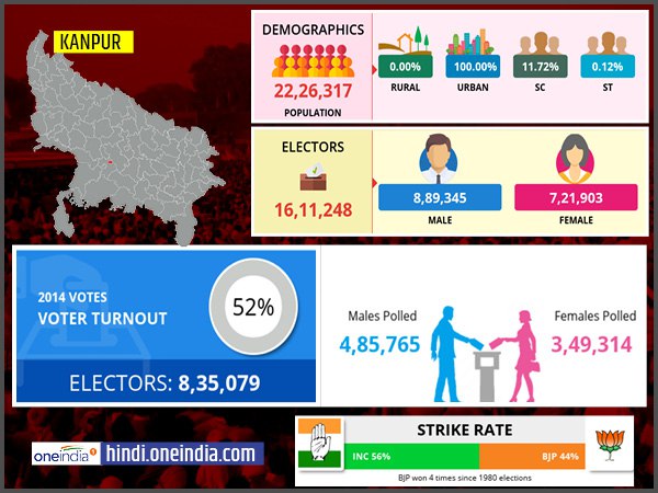 साल 2014 में यहां पर 2164392 मतदाताओं ने हिस्सा लिया, जिसमें 55 प्रतिशत पुरुष और 44 प्रतिशत महिलाएं शामिल थीं। उस साल यहां कांग्रेस दूसरे, BSP तीसरे और सपा चौथे नंबर पर रही थी, कानपुर में हिंदुओं की संख्या 82 प्रतिशत और मुस्लिमों की संख्या 15 प्रतिशत है, ये हिंदू बाहुल्य इलाका है।