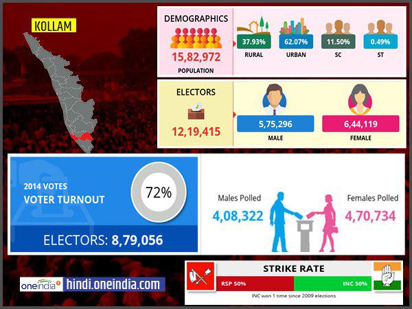 कोल्लम की कुल जनसंख्या 1582972 है, जिसमें अर्बन जनसंख्या 62.07 प्रतिशत, रूरल जनसंख्या 37.93 प्रतिशत,. एससी जनसंख्या 11.50 प्रतिशत और 0.49 फीसदी एसटी जनसंख्या है। अगर वोटर्स के आंकड़े पर गौर करें तो कोलल्म के मतदाता 1219415 है, जिसमें पुरुष मतदाताओं की संख्या 575296 और महिला मतदाताओं की संख्या 644119 है।