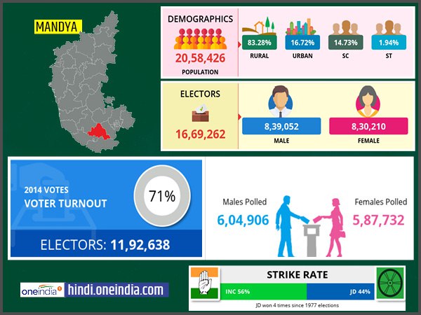 मांड्या में आठ विधानसभा सीटें हैं। अक्टूबर 2018 में यहां पर हुए चुनावों में शिवराम गौड़ा ने बीजेपी के डीआर सिद्धारमैया को हराया था। गौड़ा को चुनावों में 5,69,347 वोट हासिल हुए तो सिद्धारमैया को 2,44,404 वोट्स ही हासिल हो सके थे। पिछले करीब छह वर्षों से मांड्या में कांग्रेस और जेडीएस के बीच टक्कर देखने को मिली है। साल 2013 में भी मांड्या लोकसभा सीट के लिए उपचुनाव हुए थे। दिलचस्प बात है कि उस समय कांग्रेस की उम्मीदवार राम्या ने सीएस पुट्टाराजू को हराया था। लेकिन जब साल 2014 में चुनाव हुए तो पुट्टाराजू ने अपनी सीट वपस हासिल कर ली।