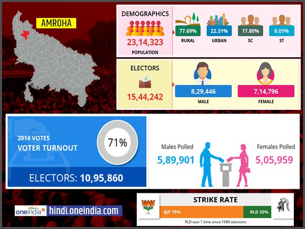 आम के लिए मशहूर अमरोहा की 25 प्रतिशत आबादी हिंदू और 73 प्रतिशत जनसंख्या मुस्लिम है, साल 2014 के चुनाव में 1544245 वोटरों ने हिस्सा लिया था, जिसमें 53 प्रतिशत पुरुष और 46 प्रतिशत महिलाएं शामिल थीं। सांसद कुंवर सिंह और सपा के हुमेरा अख्तर के बीच जीत का अंतर 14 प्रतिशत था।
