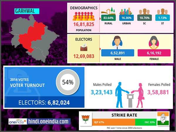 गढ़वाल लोकसभा सीट के अंतर्गत पांच जिलों की कुल 14 विधानसभा सीटें आती हैं। इनमें चमोली जिले की तीन विधानसभा सीटें- बद्रीनाथ, कर्णप्रयाग और थराली सीट, नैनीताल जिले की एक विधानसभा सीट- रामनगर, पौड़ी गढ़वाल जिले की 6 विधानसभा सीटें- चौबट्टाखाल, कोटद्वार, लैंड्सडाउन, पौड़ी, श्रीनगर और यमकेश्वर, रुद्रप्रयाग जिले की दो सीट- केदारनाथ व रुद्रप्रयाग विधानसभा सीट और टिहरी गढ़वाल जिले की दो सीटें- देवप्रयाग और नरेंद्र नगर शामिल हैं। गढ़वाल लोकसभा सीट पर कुल 1269083 मतदाता हैं, जिनमें से 652891 पुरुष और 616192 महिला वोटर हैं। कुल 1681825 की आबादी वाली इस लोकसभा सीट पर 83.64 फीसदी आबादी ग्रामीण क्षेत्रों में रहती है, जबकि महज 16.36 फीसदी आबादी शहरी है। यहां की कुल आबादी में 18.76 फीसदी लोग अनुसूचित जाति के हैं, जबकि 1.13 फीसदी लोग अनुसूचित जनजाति से आते हैं।