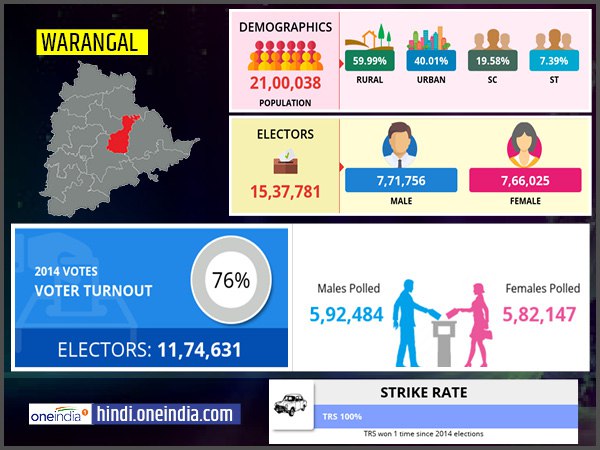 वारंगल लोकसभा निर्वाचन क्षेत्र में सात विधानसभा सीटें आती हैं, इनमें से पांच विधानसभा सीटें- पालाकुरथी, पारकल, वारंगल पूर्व, वारंगल पश्चिम और भुपालपल्ले अनारक्षित हैं तो दो सीटें- घानपुर (स्टेशन) और वारधन्नापेट अनुसूचित जाति के लिए सुरक्षित हैं, 2018 में हुए चुनावों में इनमें से छह सीटों पर टीआरएस को जीत मिली थी तो एक सीट पर कांग्रेस जीती थी। 1952 में अस्तित्व में आने के समय से यह लोकसभा सीट कांग्रेस का गढ़ रही है, यहां हुए 16 आम चुनावों में से कांग्रेस को आठ बार जीत मिली है, इनके अलावा टीआरएस और टीडीपी भी बीच-बीच में चुनाव जीतती रही हैं, टीआरएस को 2015 में हुए उपचुनावों को मिलाकर तीन बार जीत मिली है, साल 2015 के उपचुनाव में कांग्रेस को धूल चटाने वाले दयाकर पासुनूरी पहली बार यहां से सांसद चुने गए हैं।