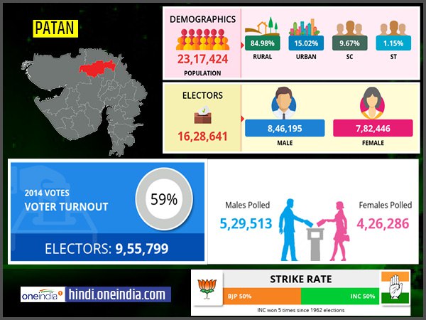 पाटन सीट पर 88 प्रतिशत मतदाता हिन्दू हैं जबकि 11 प्रतिशत मुसलमान। बात अगर 2014 के चुनावों की करें तो 1,628,641 मतदाताओं का नाम सूची में था, जिनमें से 955,799 लोगों ने मतदान किया। जिनमें 5.2 लाख पुरुष और 4.2 लाख महिलाएं शामिल थीं। और कुल वोट प्रतिशत 59 प्रतिशत था। इस चुनाव में वाघेला ने कांग्रेस नेता राठौड़ भावसिंहभाई दयाभाई को 138719 वोटों के अंतर से हराया था।