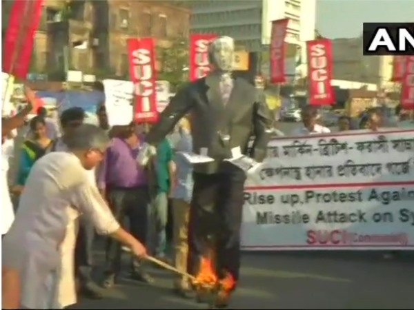 कोलकाता। सीरिया पर अमेरिका के नेतृत्व में हुए हवाई हमलों के खिलाफ दुनियाभर में कई संगठन विरोध प्रदर्शन कर रहे हैं। रविवार को कोलकाता में सोशलिस्ट यूनिटि सेंटर ऑफ इंडिया(कम्यूनिस्ट) ने अमेरिकी प्रशासन के खिलाफ विरोध प्रदर्शन किए। संगठन के सैंकड़ों कार्यकर्ता सड़कों पर उतर आए। उन्होंने राष्ट्रपति डोनाल्ड ट्रंप के विरोध में जमकर नारेबाजी की। विरोध प्रदर्शन कर रहे लोगों ने प्रेसिडेंट ट्रंप का पुलता भी जलाया।