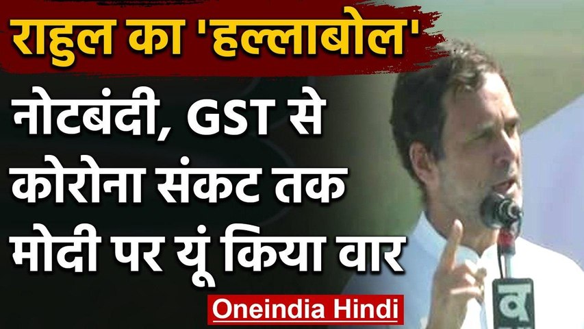 राहुल गांधी ने कहा कि छह साल से दिल्ली में नरेंद्र मोदी जी की सरकार है और छह साल से ये सरकार गरीबों, मज़दूरों, किसानों पर एक के बाद एक आक्रमण कर रही है। इनकी एक भी नीति गरीब जनता को फायदा पहुंचाने की नहीं है, इनकी सब नीति इनके 3-4 चुने हुए मित्रों के लिए बनाई जाती हैं।