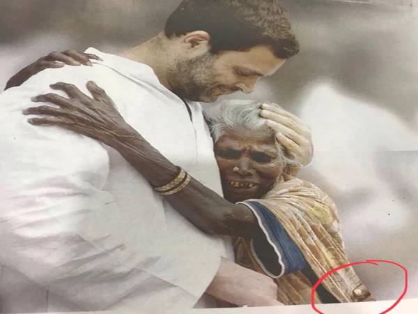 नई दिल्ली। लोकसभा चुनाव से कुछ दिन पहले कांग्रेस अध्यक्ष राहुल गांधी एक बुजुर्ग महिला की फोटोशॉप इमेज को लेकर ट्रोल हो गए। दरअसल जो फोटो सोशल मीडिया पर शेयर की जा रही है उसमें राहुल गांधी एक बुजुर्ग महिला को गले लगाते हुए दिखाई दे रहे हैं, लेकिन फोटो में चार उंगलियां दिखाई दे रही हैं। बस इसी बात को लेकर ट्रोलर राहुल गांधी पर बिफर पड़े और ट्रोल करने लगे कि इस फोटो में तीसरा हाथ किसका है।