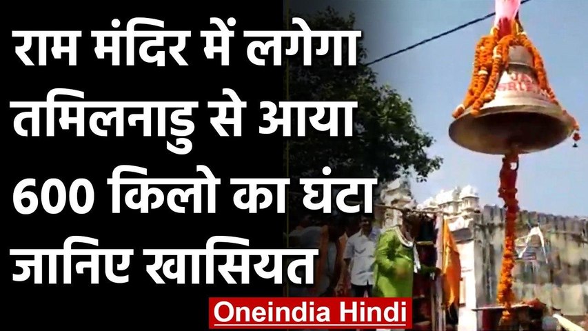 Ram जय श्री राम 'के मंत्रों के बीच, चेन्नई स्थित कानूनी अधिकार परिषद के महासचिव राजलक्ष्मी मंडा द्वारा मंदिर ट्रस्ट सदस्यों को विशाल घंटी सौंपी गई। राम मंदिर के लिए विशेषज्ञों द्वारा घंटी को कस्टम बनाया गया था। मंदा ने दावा किया कि घंटी की गूंज के साथ ओम की आवाज के साथ 8-10 किमी की परिधि में सुनी जाएगी। इसकी ऊंचाई 4.13 फीट और चौड़ाई 3.9 फीट है। महासचिव राजलक्ष्मी मंडा "जय श्री राम" के साथ कांस्य की घंटी बजाकर भगवान राम, देवी सीता, लक्ष्मण, भगवान हनुमान, और भगवान गणेश की मूर्तियों को भव्य राम मंदिर में स्थापित किया।