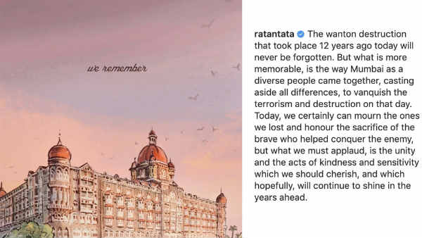 रतन टाटा ने ताज होटल की जो पेंटिंग शेयर की है, जिस पर लिखा है 'हमें याद है। इसके साथ उन्होंने पोस्ट में लिखा, 'आज से 12 साल पहले जो विनाश हुआ, उसे कभी भुलाया नहीं जा सकेगा, लेकिन जो ज्यादा यादगार है, वह यह कि उस दिन आतंकवाद और विनाश को खत्म करने के लिए जिस तरह मुंबई के लोग सभी मतभेदों को भुलाकर एक साथ आए।' उन्होंने आगे लिखा, 'हमने जिनको खोया, जिन्होंने दुश्मन पर जीत पाने के लिए कुर्बानियां दीं, आज हम जरूर उनका शोक मना सकते हैं। लेकिन हमें उस एकता, दयालुता के उन कृत्यों और संवदेनशीलता की भी सराहना करनी होगी जो हमें बरकरार रखनी चाहिए और उम्मीद है कि आने वालों में यह और बढ़ेगी ही।' यह पोस्ट सोशल मीडिया पर खूब वायरल हो रहा है, उनके इस पोस्ट पर यूजर्स भी जमकर अपनी प्रतिक्रियाएं दे रहे हैं। रतन टाटा के पोस्ट पर कमेंट्स करते हुए लोग उस दिन आतंकियों से लोहा लेने वाले देश के बहादुर जवानों को याद कर रहे हैं। 12 साल पहले 26 नवंबर को रात करीब 9 बजे आतंकी मुंबई के दो सबसे प्रतिष्ठित होटलों , होटल ताज और ओबेरॉय ट्राइडेंट में दाखिल हुए। होटल ताज में छह धमाके हुए थे। ताज में आतंकियों ने 200 लोगों को बंधक बनाकर रखा था।भले ही होटल ताज ने हमलों में सबसे ज्यादा नुकसान देखा लेकिन आज भी पर्यटकों का भरोसा इस पर कायम है। यह दोनों ही होटल सीएसटी से करीब दो किलोमीटर की दूरी पर हैं।