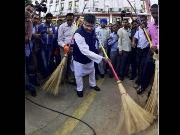 नई दिल्ली। केंद्रीय कानून मंत्री रविशंकर प्रसाद ने दिल्ली स्थित अपने कार्यालय में झाड़ू लगाकर स्वच्छ भारत अभियान की शुरुआत की। इससे पहले मानव संसाधन मंत्री स्मृति ईरानी ने झाड़ू लगाकर इस अभियान का हिस्सा बनीं थी। प्रधानमंत्री नरेंद्र मोदी ने स्वतंत्रता दिवस के मौके पर भारत को स्वच्छ बनाने की मुहिम का एलान किया था।