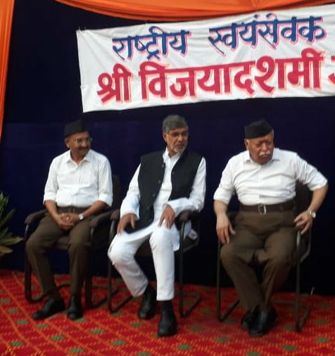 आरएसएस के वार्षिक विजयदशमी के कार्यक्रम में कैलाश सत्यार्थी को मुख्य अतिथि के तौर पर आमंत्रित किया गया है। इस कार्यक्रम का आयोजन नागपुर के रेशीमबाग मैदान में आयोजित किया गया है। इस मौके पर बोलते हुए कैलाश सत्यार्थी ने कहा कि भारत विविधताओं का देश है, कहने का मतलब है कि भारत कई रंगों के फूलों के गुलदस्ते की तरह है। यही हमारी ताकत है।बच्चों की पॉर्नोग्राफी का धंधा लगातार बढ़ता जा रहा है जो बहुत ही चिंताजनक है। मैं चाहता हूं इसके लिए एक अंतरराष्ट्रीय कानून बने। दुनिया में ऐसी कोई ताकत नहीं पैदा हुई जो भारत की आत्मा को मार सके, लेकिन कुछ लोग हमारे अंदर मानसिक हीनता डाल गए जिस वजह से हम अपनी भाषा और संस्कृति पर अभिमान नहीं कर पाते।