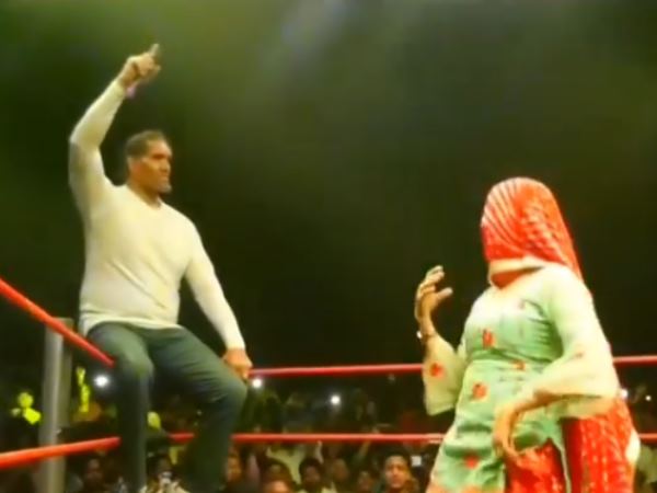 VIDEO: घूंघट डालकर सपना चौधरी ने रिंग में किया डांस, द ग्रेट खली भी लगे थिरकने